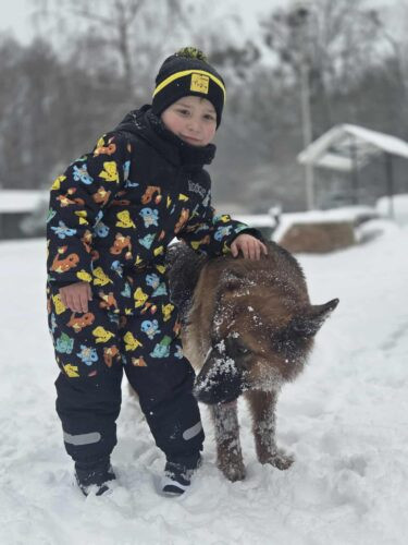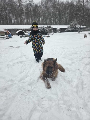 Cwaniak uczy się chodzić na smyczy, lubi się z suczkami , już lepiej reaguje na dotyk człowieka ale nie domaga się go.