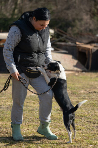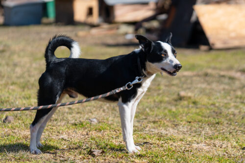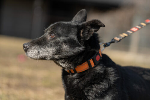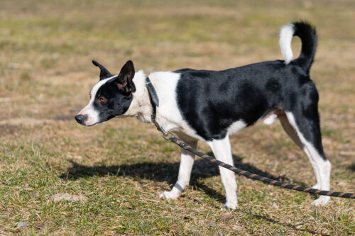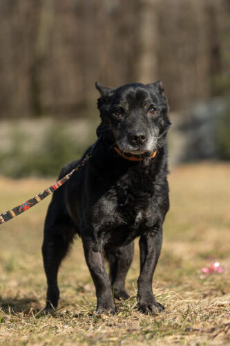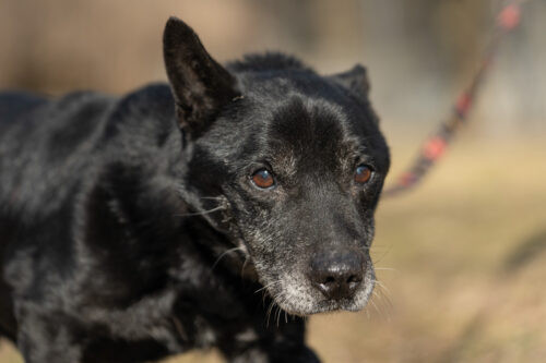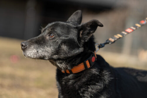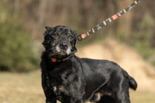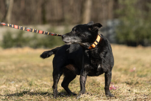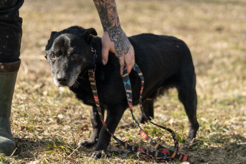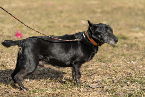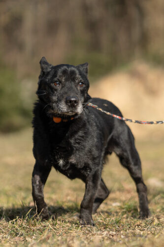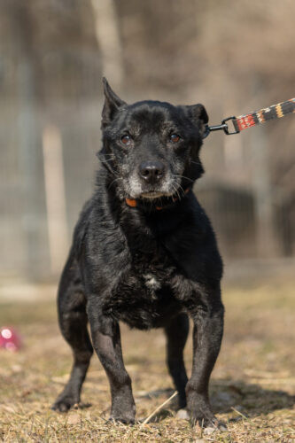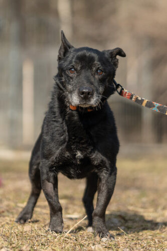 Panicz powoli nabiera zaufania zaczął wychodzić na smyczy ,czarne pieski są w schronisku niezauważalne..